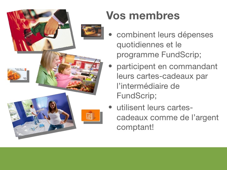 - Encouragez les membres qui soutiennent votre campagne à payer leurs achats quotidiens et leurs cadeaux avec des cartes-cadeaux achetées auprès de FundScrip. Chaque achat génère des gains pour la campagne. Les membres ne sortent rien de leur poche et peuvent garder les mêmes habitudes de magasinage.